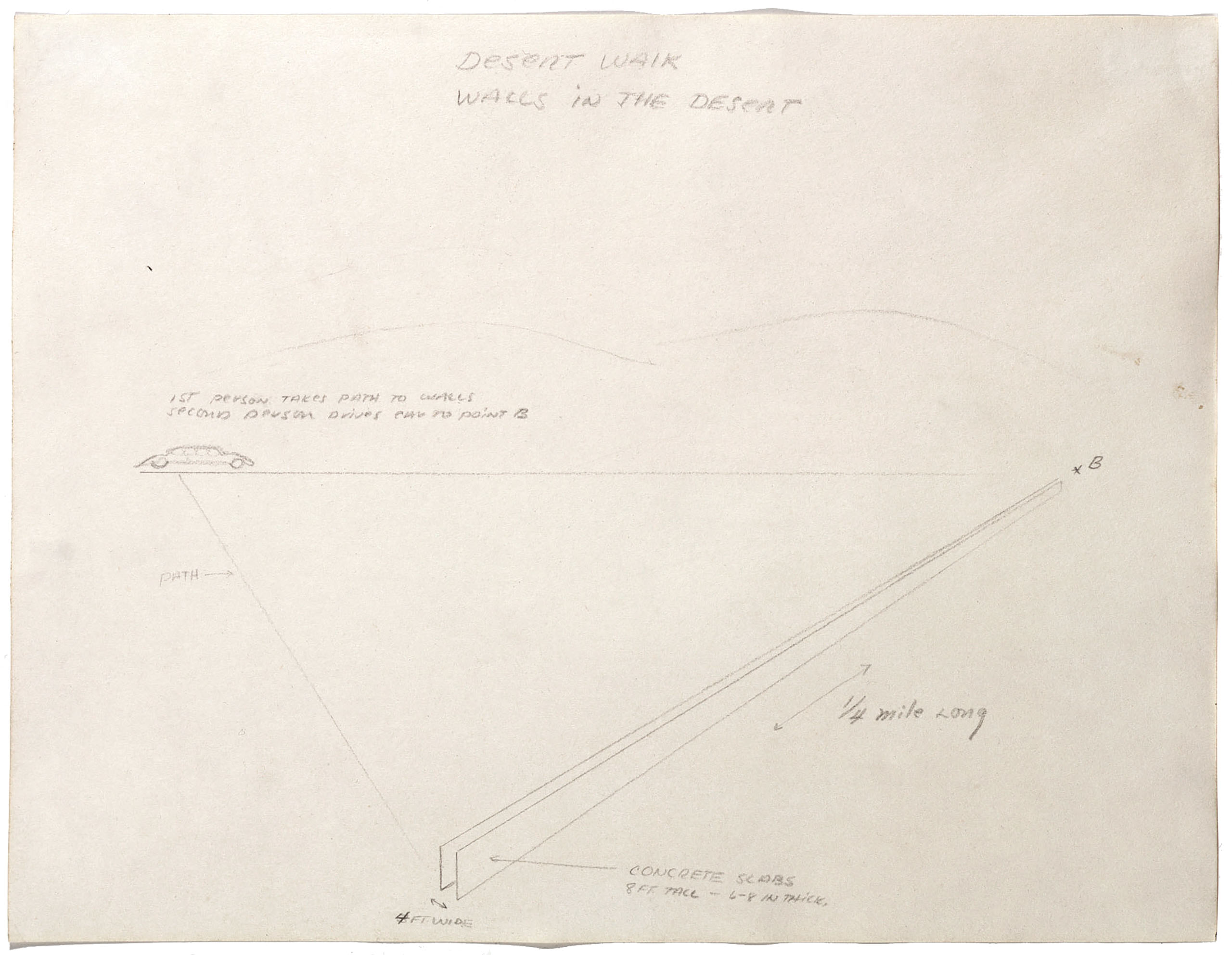 Auf seinem Weg zwischen den Walls in the Desert sieht sich der Besucher nun der Erbarmungslosigkeit der Zentralperspektive ausgesetzt, die ihm, ein eindimensionales Labyrinth, keinen Ausgang oder Ausweg zeigt. Das Außen ist in seiner Verborgenheit in erhöhter Präsenz gegenwärtig, seine Sichtbarkeit beschränkt oder konzentriert auf den Himmel. Dieser Himmel ist das einzige, das sich, außer der 1st person selbst, während des halbstündigen Gangs wird verändern können. Gegen Ende erscheint dann dort, wo zuvor der Fluchtpunkt war, in einer Art perspektivischem accellerando erneut die Landschaft, wie eine Erscheinung, einer Epiphanie gleich, und so eine andere geworden – der Besucher ist gleichsam »an einem anderen Ort«, wie es bei Hebel so beunruhigend heißt. — Er geht nun in der Richtung der Mauern geradeaus weiter, um schließlich an einem festgelegten Punkt das Auto zu erreichen, das in der Zwischenzeit von einer second person, wie die genannte Zeichnung festlegt, dorthin gefahren wurde. Vor dem Hintergrund zweier später Arbeiten, Bel Air Trilogy, 2000-2011 und Truck Trilogy, 2011-2017, in denen Autos eine tragende Rolle spielen, wird deutlich, daß auch hier der second person, ihrer Bewegung und dem Auto selbst eine alles andere als dienende Bedeutung zugedacht ist. — Die Summe der unterschiedlichen Bewegungen ist also als Dreieck festgelegt, für das indes keine geometrische Spezifikation definiert ist – ein Dreieck, das sich aus drei gänzlich unterschiedlichen Schenkeln bildet.